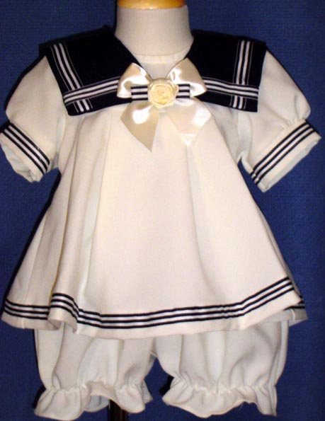 This is the cutest little dressy sailor dress set for your baby girl! Made of cream polyester, it features a navy sailor collar and short puffed sleeves edged with navy blue and cream ribbon. The collar is accented by a cream satin bow centered with a striped bow and topped by a cream satin rosebud. A softly pleated skirt falls from the yoke with the hem edged with navy blue and cream ribbon. The dress buttons in the back. Cute little matching cream pantaloons complete the sweet and feminine look.