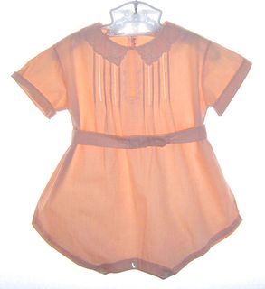 This sweet little melon colored cotton romper was handmade in the 1930s. Suitable for a baby boy or a baby girl, it features pintucks on the chest embroidered with tiny white flowers separated by rows of delicate fagoting. The little Peter Pan collar is embroidered in white with scalloped edges and the short sleeves have turned back cuffs. Button the matching belt in front for your baby boy or turn it around or tie with a ribbon for your baby girl. This little suit closes in the back and the crotch with small buttons, as was customary in 1930s baby clothing.