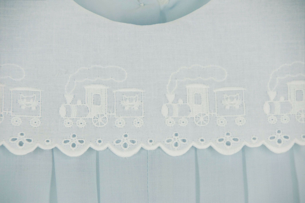 NEW Anvy Kids Blue Romper with Train Embroidered White Portrait Collar