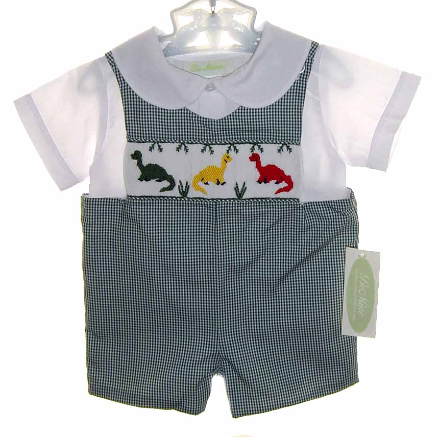 NEW Be Mine Green Checked Smocked Shortall Set with Embroidered Dinosaurs