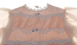This elegant little Victorian inspired baby dress was hand crafted in a beautiful shade of blush pink silk. The attached petticoat is silk taffeta edged with heavy ivory cotton lace, while the dress is a delicate gossamer textured silk. The ruched yoke is trimmed with ivory lace and silk rosebuds, as are the long sheer sleeves. The dress closes in the back with three small buttons.