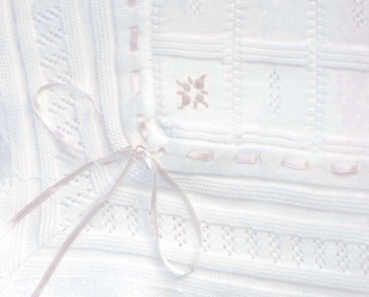 This lovely large white baby blanket is made by Feltman Brothers, a top designer of quality baby garments. Made of a heavy white cotton knit, it features an intricate design with blue satin ribbon insertion and blue embroidery (pictured left) or pink satin ribbon insertion and pink embroidery (pictured below). The ideal take home blanket for bringing your new baby boy or baby girl home from the hospital. Perfect too as a lovely christening blanket or any dress-up blanket. Makes a thoughtful newborn or baby shower gift!