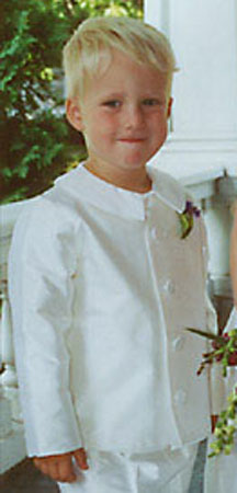 This gorgeous pearl white silk Eton suit is made by Gordon & Company, a leading manufacturer of classic children's dress clothing. The front buttoned cotton shirt features a Peter Pan collar with long buttoned cuffed sleeves. The pleated long pants have an elasticized back waistband for a good fit. The lined pearl white silk jacket has long sleeves and closes with 4 silk covered buttons.