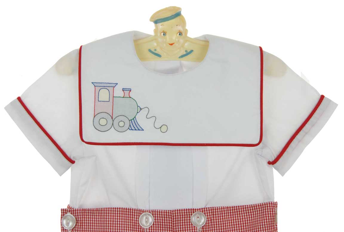 NEW Judy Lynn Red Checked Button On Shorts Set with Appliqued TrainCC05271Regular price: $50.00Now only: $40.00Size: Sold Out Baby and Toddler Button On Shorts Sets: Judy Lynn Button on Shorts SetsSize 24 months shoulder width=9¼"Back length to crotch=17¾"NewNote: This outfit runs small. You may wish to order a size larger than usual.Grammie's Attic has the largest selection of boys' classic baby clothing and boys' classic toddler clothing you'll find. Be sure to see all our sweet baby boys' rompers, baby boys' bubbles, baby button on shorts sets, toddlers' outfits, and more!Size 24 month is sold out