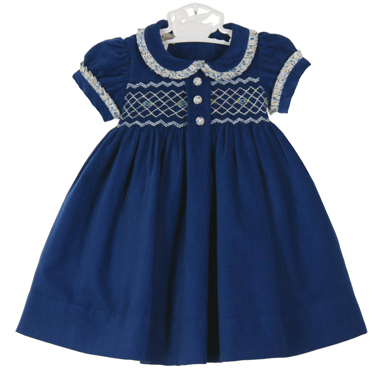 NEW Marco & Lizzy Royal Blue Smocked Corduroy Dress with Floral Pleated TrimLarger sizes shown below.CC14134$75.00Size: 3 months 12 months 18 months 5 6x This beautiful dress runs a bit small in the bodice. You may wish to order one size larger than usual. You may also be interested in:NEW White Tights for Babies,Toddlers, and Little GirlsNEW Sarah Louise White Cotton Cardigan Sweater with Openwork for Babies, Toddlers, and Little GirlsOnly one available in size 3 monthsOnly one available in size 12 monthsOnly one available in size 18 monthsTwo available in size 5 (additional $10.00)Only one available in size 6x (additional $10.00)Click an image below to enlarge