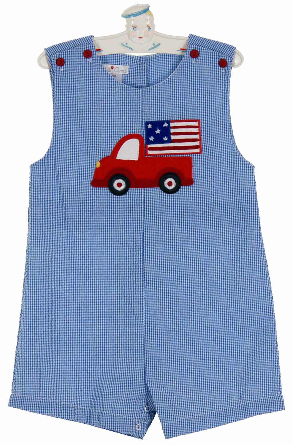 This darling blue checked seersucker shortll is made by Petit Ami. It has a red appliquéd truck and flag across the chest. The shortall buttons on the shoulders and snaps in the crotch for easy changes.