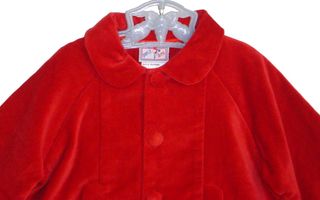 Made by Petit Ami, a leading designer of classic children's clothing for more than 40 years, this darling little light weight red cotton velvet baby coat features a Peter Pan collar and mock pockets with raglan sleeves and velvet covered buttons. The coat is fully lined.