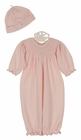Made by Petit Ami, a leading designer of classic children's clothing for more than 40 years, this precious little white convertible baby gown features a smocked yoke with red embroidered rosebuds. Made of softest pima cotton knit, it has a back snapped closure with a simple round neckline and long sleeves with elasticized sleeve ruffles. The long gown is elasticized at the bottom and converts to a romper by reversing the way it snaps. It even comes with a matching hat.
