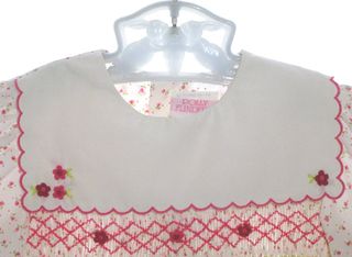 What a sweet little floral print baby dress! Made by leading classic baby clothing designer Polly Flinders, this new cotton blend dress has a creamy white background covered with tiny pink flowers. It features a portrait collar embroidered with little pink flowers and edged with pink scalloped embroidery. The yoke is smocked in pink and embroidered with more of the pink flowers. The long sleeves are finished with buttoned turned back cuffs edged with pink scalloped embroidery.