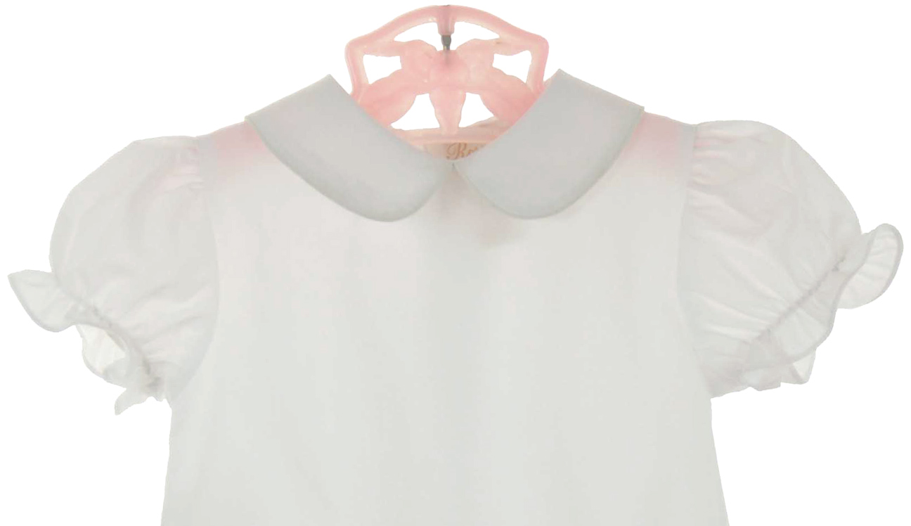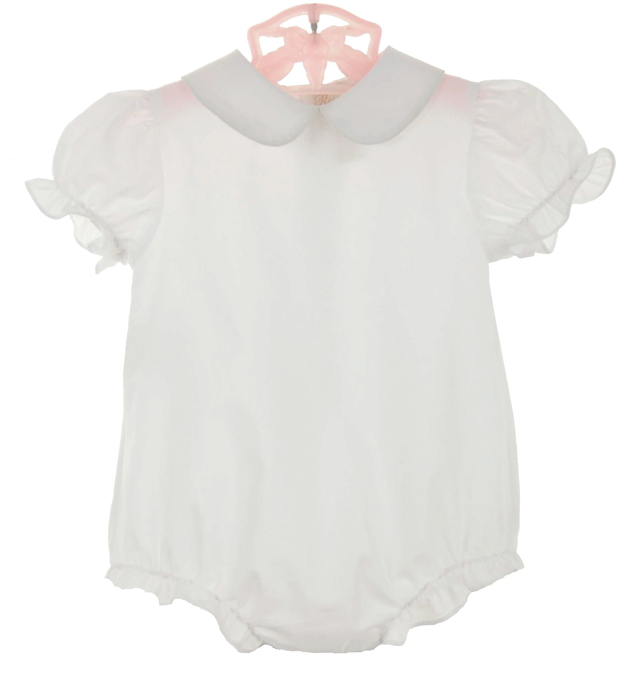 This sweet and simple little cotton blend white shirt is made by Rosalina, a leading designer of quality childrens' apparel. It features a Peter Pan collar, short puffled sleeves finished with elasticized ruffles and a back buttoned closure. The snap crotch with elasticized leg openings ensures no worries about untucked shirt tails. Perfect for your baby girl to wear under her summer rompers to extend them for fall and winter wear! Also the ideal little shirt to wear with a jumper or dressed up with a holiday or monogrammed collar.