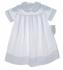 This beautiful little white cotton blend baby gown is made by Rosalina, a leading designer of classic children's clothing. It features soft pleats falling from the high yoke, with a Peter Pan collar and short sleeve cuffs edged with pink striped piping. It closes in the back with two little buttons.