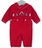 This darling little red pure cotton corduroy outfit is made by Royal Child, a leading designer of beautiful baby garments. It features a hand smocked top embroidered with holiday designs. This sweet little outfit has a red collar and long sleeves finished with narrow buttoned cuffs both edged with white piping. The pants button on to the top in the classic style that ensures no untucked shirt tails. The shirt buttons in the back and the pants snap in the crotch for easy changes.