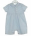 This adorable little blue cotton blend batiste baby romper is made by Sarah Louise, a top British designer of beautiful baby garments. It features horizontal pintucks on the front anchored with shell buttons and centered with a beautiful hand embroidered design. The same lovely embroidery is repeated on the collar and short sleeves. The romper buttons in the crotch for ease in dressing and closes in the back with small buttons. The matching hat has embroidered detail. This beautiful little romper is the perfect take home outfit for bringing your new baby boy home from the hospital. It also makes an ideal dedication outfit or outfit for baby's first portraits.