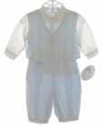 This darling little white cotton blend pants set is made by Sarah Louise, a top British designer of beautiful baby garments. It features a front buttoned white pintucked shirt with an attached white pintucked vest. The shirt has a white collar and long cuffed sleeves finished with decorative stitching. The white pants have both front and back inverted pleats and straight legs and attach with buttons to the top. The pants button in the crotch for easy changes.