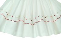 This adorable little white cotton blend batiste smocked baby dress is made by Sarah Louise, a top British designer of beautiful baby garments. It features a hand smoked yoke accented with red embroidery. This sweet little dress has a red scalloped neckline accented with white flowers with red openwork and long sleeves finished elacticized ruffles with red scalloped embroidered trim. The dress is finished with a deep 3" hem topped by red scalloped embroidery and white embroidered flowers with red openwork. It has an attached ruffled petticoat for added fullness and closes in the back with three small buttons. Sizes 12 months and 18 months have a sash in the back to tie in a bow.