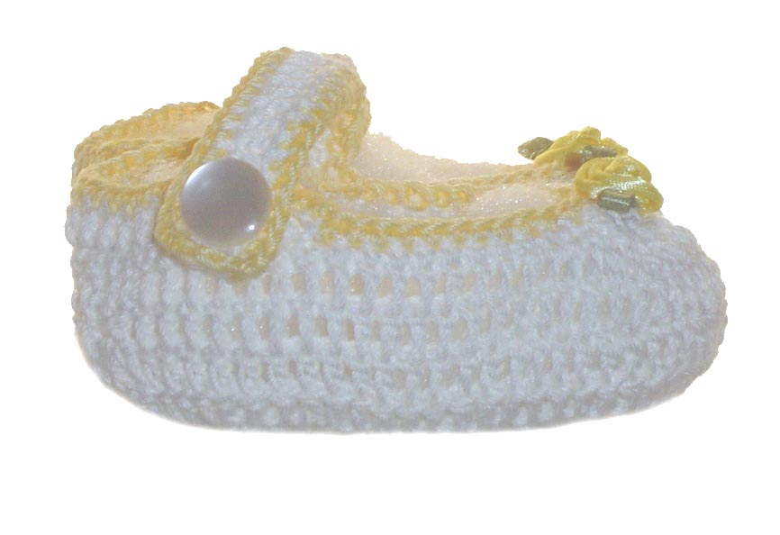 These are the sweetest little white hand crocheted booties with yellow trim! Made in Mary Jane style with a little strap closed by a pearl button, the booties feature a tiny yellow ribbon rose on the toe. They are perfect for christening booties, a baby shower gift or a newborn baby gift!