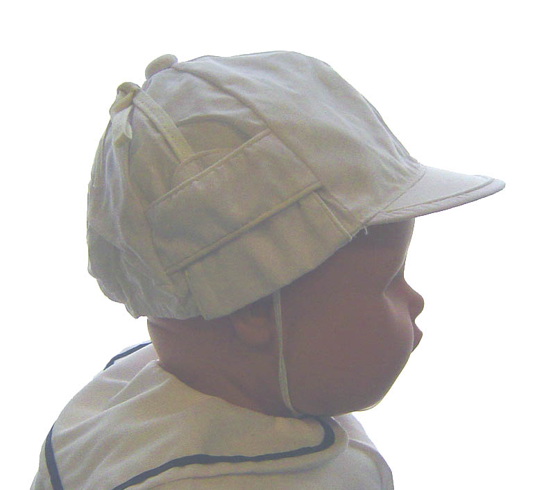 This sweet old-fashioned style hat for baby boys has a convertible feature that adds to its practicality. Made of white cotton, it has earflaps that tie on the top for warm weather but can be tied under the chin when it's cooler outside. The perfect little all-weather hat for your baby boy!