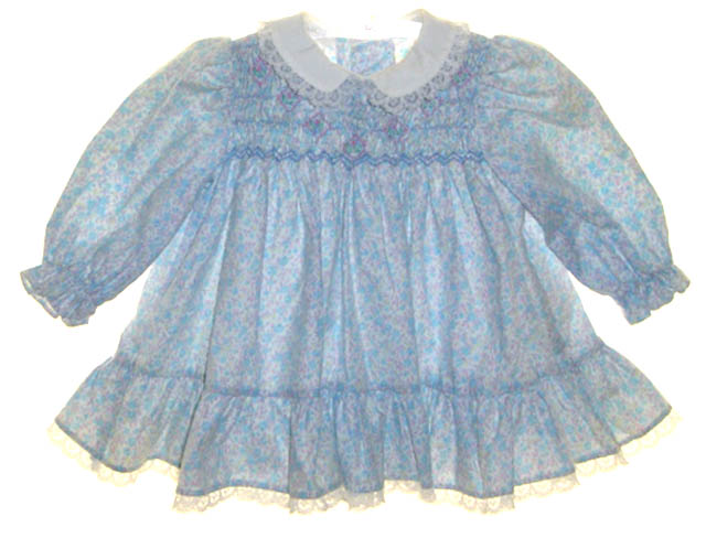 This dainty little blue and pink print cotton blend baby dress is from Polly Flinders, a timeless designer of classic smocked baby clothing. It features a yoke hand smocked in blue and pink and embroidered with tiny pink flowers in pink diamond shapes. The white collar is trimmed in soft lace and the long sleeves end with elasticized ruffles. The dress features a laced edged bottom ruffle.