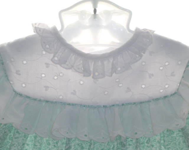 What a versatile little green print cotton blend dress from Polly Flinders, a timeless designer of classic smocked baby clothing. It features a white eyelet yokeedged with green print piping and a ruffle of white eyelet. The simple round neckline is edged with ruffled eyelet and the short puffed sleeves end with elasticized ruffles. The dress is finished with a white eyelet ruffle that peeks out under the hem and it closes in the back with two tiny buttons.