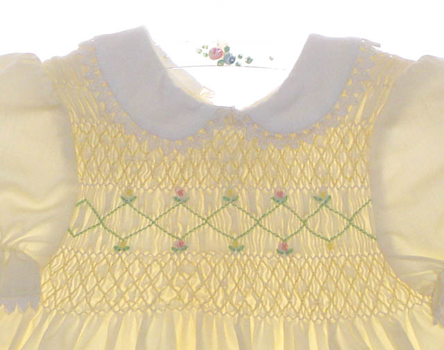 Polly Flinders Pale Yellow Smocked Baby Dress with White Lace Trimmed Collar