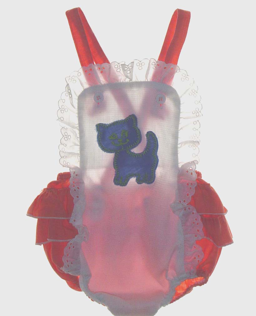 This is the most adorable little retro style sunsuit for your baby girl! This soft red sunsuit has a kitten applique on the white bib with eyelet edging around the front bib and elasticized leg openings. The shoulder straps button to the front bib and the buttons can easily be moved down to adjust the size. The crowning touch to this adorable little outfit is the double row of ruffles across the bottom.