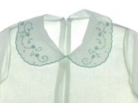 This beautiful little diaper shirt was made in the Philippines in the 1950s. It features a collar beautifully embroidered with french knots, appliques, and tiny flowers. The collar is edged with scalloped embroidery. The long sleeves are finished with elasticized ruffles edged with scalloped embroidery. The diaper shirt closes in the back with two tiny buttons.