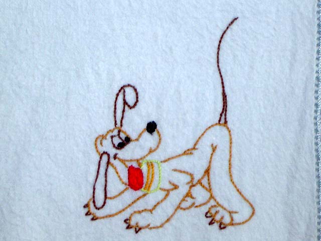 This is a darling little vintage flannel long kimono. Made in the 1930s, it is soft pale blue flannel with the Pluto Disney character hand embroidered at the hem and little bumblebees flying about.