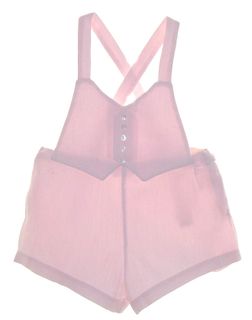 This is the most adorable little pink corded cotton sunsuit outfit from the 1940s. The little vest style sunsuit is trimed with five tiny shell buttons. The shoulder straps button to the tabs at the pleated back waistband and the buttons can easily be moved up or down to adjust the size. The matching top buttons in the front with five tiny shell buttons and the Peter Pan collar and short sleeves are edged with fine lace trim. The perfect sunsuit set for your baby girl.