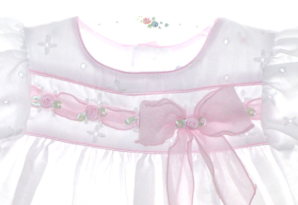 White Eyelet Dress and Matching Bonnet with Pink RibbonCC0451A$35.00Size: sold out Eyelet Baby Dresses: Baby Dresses with BonnetsShoulder width=7"Back length=13"Nearly NewSize 6 to 9 months is sold out