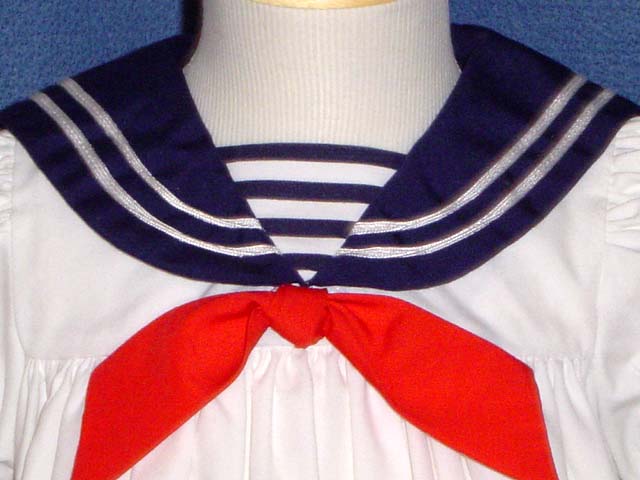 This is the sweetest little white sailor dress! Made of the white cotton blend, it features front and back yokes with a full gathered skirt. The navy sailor collar and short puffed sleeves are trimmed with white braid. A navy and white striped inset and red sailor tie complete the nautical look. A band of matching navy and white striped fabric finishes the hem, which is topped by a red anchor insignia. The dress buttons in the back.
